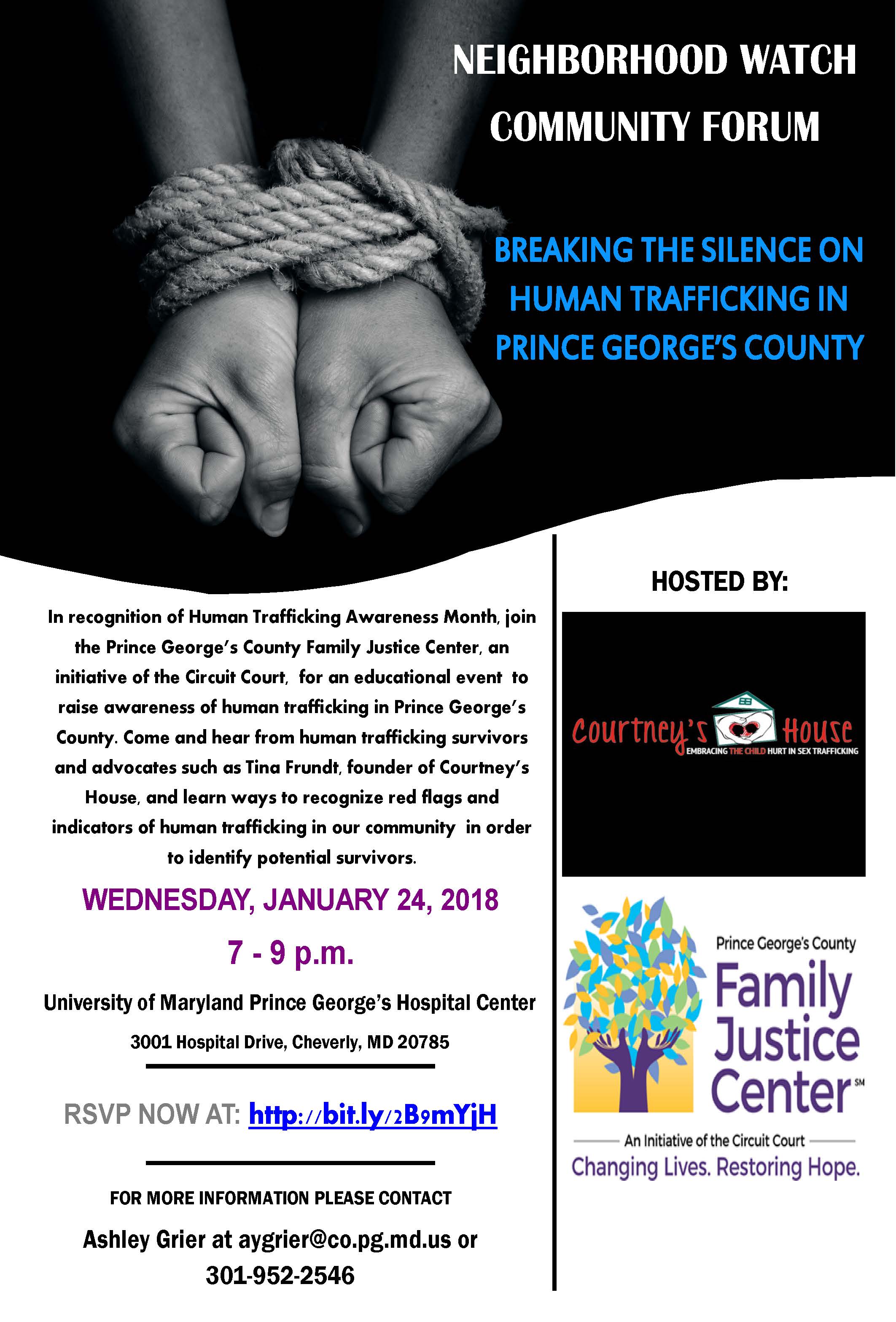 On Wednesday, January 24, 2018, the Prince George’s County Family Justice Center, an initiative of the Circuit Court, will host Neighborhood Watch Community Forum: Breaking the Silence on Human Trafficking in Prince George’s County. Panelists will include Tina Frundt of Courtney’s House, a nonprofit drop-off center that assist victims of sexual trafficking. The event will be held at University of Maryland Prince George’s Hospital Center, 3001 Hospital Drive, Cheverly, MD 20785 from 7 to 9 p.m.