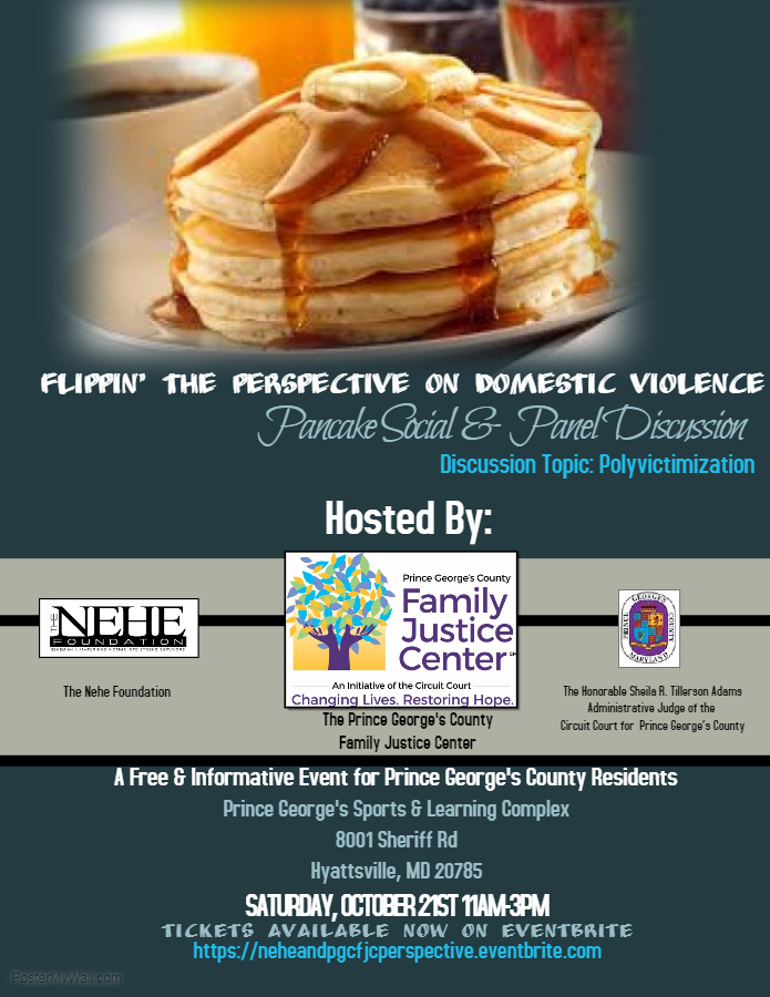 In recognition of Domestic Violence Awareness Month, on Saturday, October 21, 2017, the Prince George’s County Family Justice Center, an initiative of the Circuit Court, in partnership with The NEHE Foundation will discuss polyvictimization, which refers to the experience of multiple victimizations of different kinds, such as sexual abuse, physical abuse, bullying and exposure to family violence, not just multiple episodes of the same kind of victimization, according to the website polyvictimization.org. The event, Flippin’ the Perspective on Domestic Violence: Pancake Social and Panel Discussion on Polyvictimization, will be held at Prince George’s Sports and Learning Complex, 8001 Sheriff Rd., Hyattsville, Md. from 11 a.m. to 3 p.m. The event is free. Click here to register.