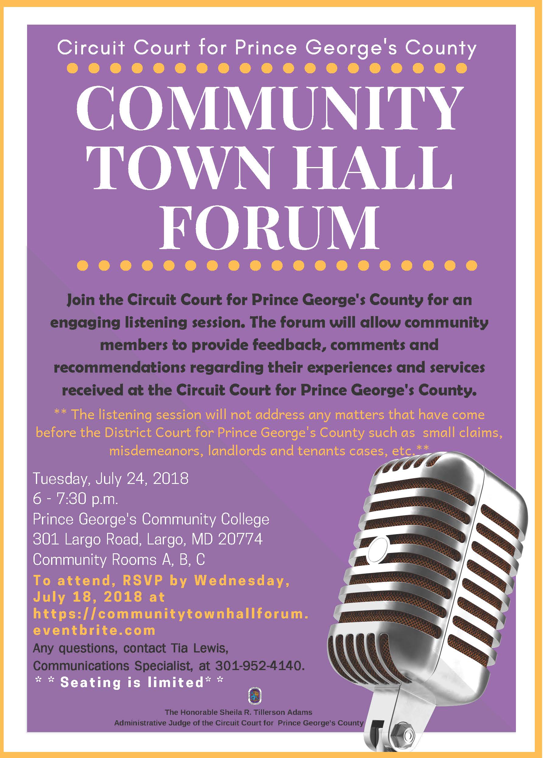 To attend or for more information, go to communitytownhallforum.eventbrite.com or visit the Circuit Court for Prince George’s County website.